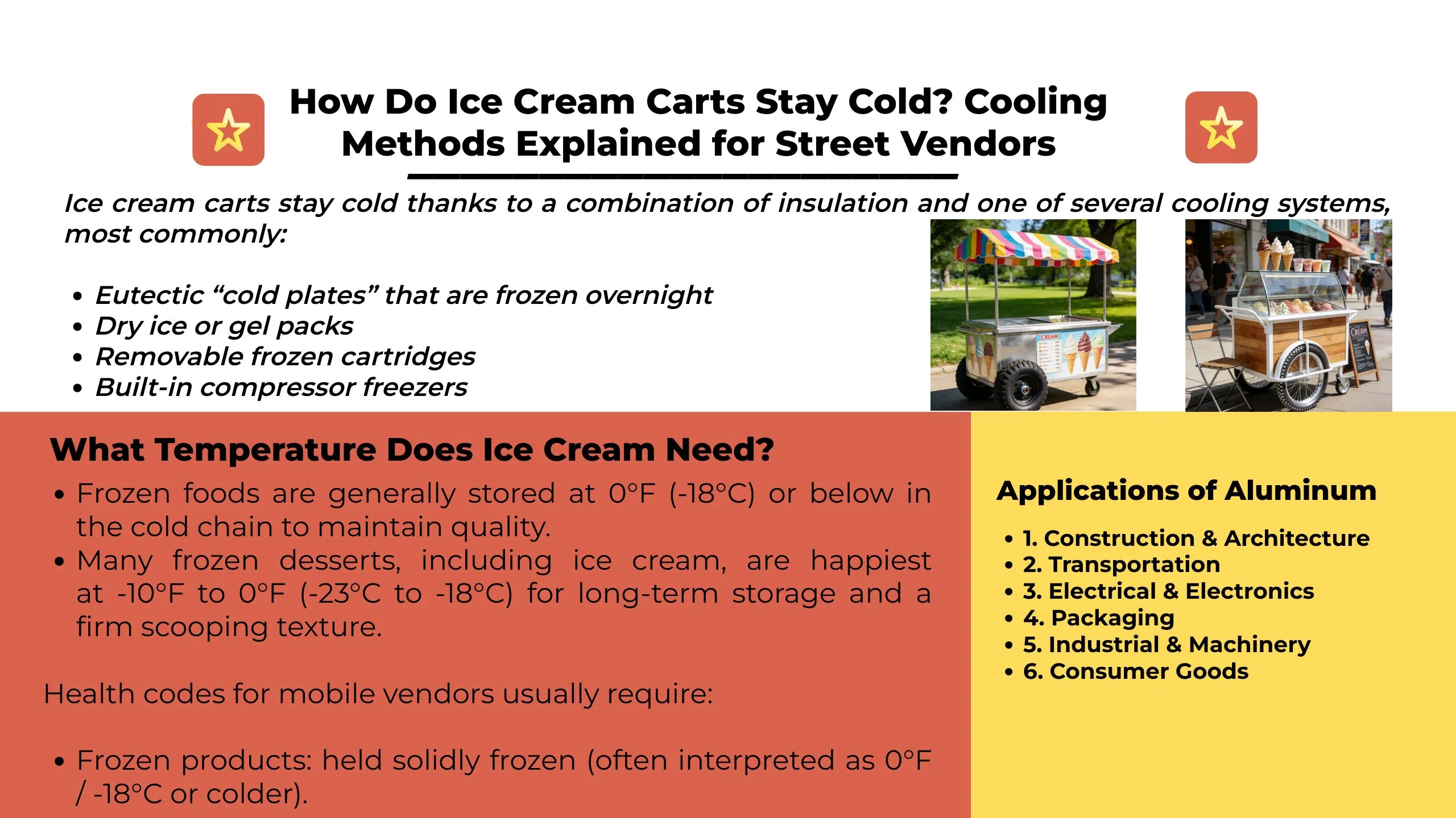 How do ice cream carts stay cold for hours in the sun? Learn how insulation, cold plates, dry ice, gel packs and built-in freezers work, what temperatures ice cream really needs, and which cooling method is best for your push cart or mobile vending business.