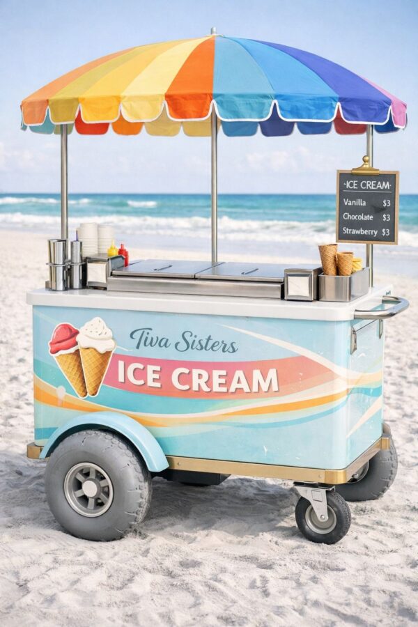 A beach-ready ice cream push cart equipped with fat tires or sand wheels for smooth movement on soft ground. Designed for coastal vending, outdoor routes, and tourist areas. Fully customizable by Tiva Sisters.