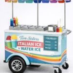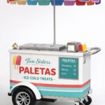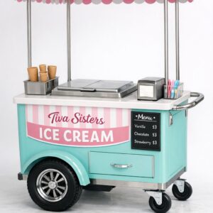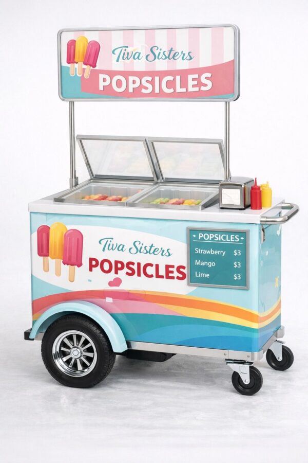 A dedicated popsicle vending cart designed for fast service and organized frozen novelty storage. Built for high-traffic events and street routes. Fully customizable by Tiva Sisters.
